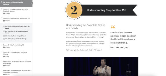 In this video-led course, you’ll learn how to create, support, and sustain a thriving stepfamily ministry in ways that help couples begin healing. We’ll also help you address tough questions about divorce and remarriage—responding with mercy, grace, and truth. And you’ll gain dynamic methods to lead “community experiences” that transform lives.