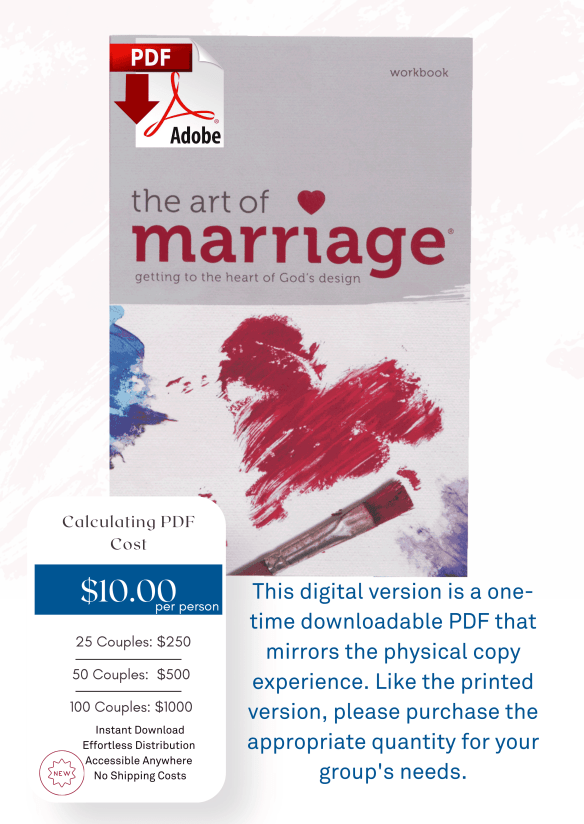 This Art of Marriage®️ Classic – Small Group Digital Workbook is a one-time downloadable PDF that mirrors the physical copy experience. Like the printed version, we kindly ask that you purchase based on the quantity needed for each person in your group.