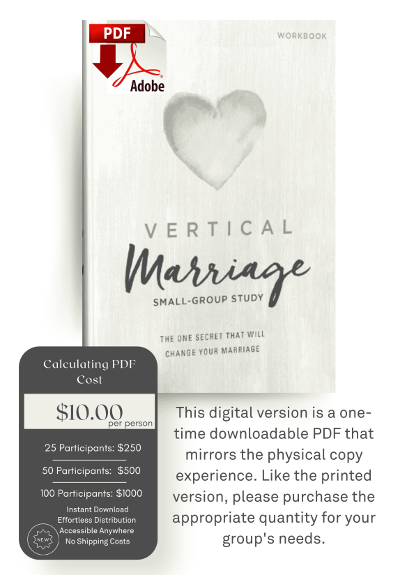 Designed to complement the Vertical Marriage Small Group Leader Kit by Dave and Ann Wilson, this workbook helps couples deepen their connection with God and each other. We’ve created a digital version for you and your group! This one-time downloadable PDF mirrors the physical copy experience. Like the printed version, we kindly ask that you purchase based on the number of participants in your group.