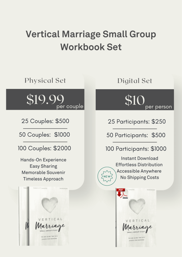 Designed to complement the Vertical Marriage Small Group Leader Kit, which features a transformative 5-week journey led by Dave and Ann Wilson, this digital workbook is an indispensable resource for couples eager to deepen their connection and fortify their relationship with God and each other.
